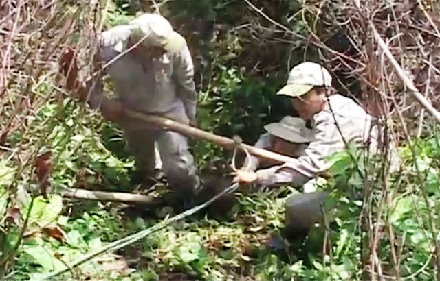 | Đội rà phá bom mìn lưu động tỉnh Quảng Trị đưa bom từ suối lên. Ảnh: Nhân Dân |