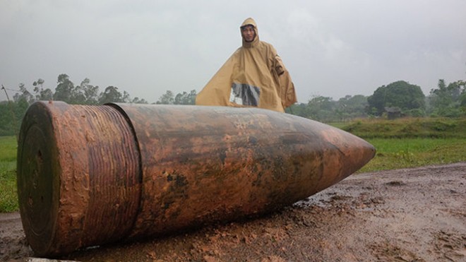 Quả đạn pháo nặng 860kg còn nguyên kíp nổ ở Quảng Trị. Ảnh Tuổi Trẻ |
