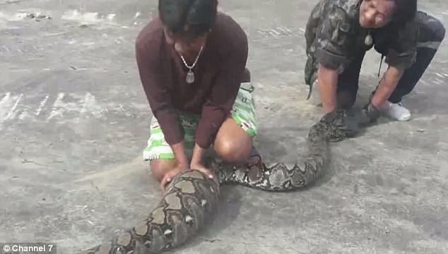 Người dân bắt con trăn nôn dị vật ra. Ảnh: Daily Mail |