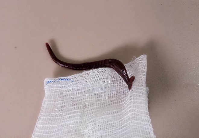 Con vắt dài 5cm được các bác sĩ lấy ra khỏi hốc mũi bé gái. Ảnh: Tri thức trực tuyến. |