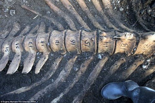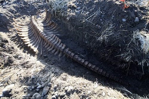 Những chiếc xương sườn của con vật đã chìa ra khỏi bờ viển giống như một “hàng rào”. Sau 8 giờ đồng hồ đào bới, các nhà khoa học đã phát hiện ra xương của một con bò biển vốn rất phổ biến tại những hòn đảo năm giữa Nga và Alaska.Họ đã tìm thấy 45 đốt xương sống, 27 xương sườn và những loại xương khác của con vật bị mất đầu.