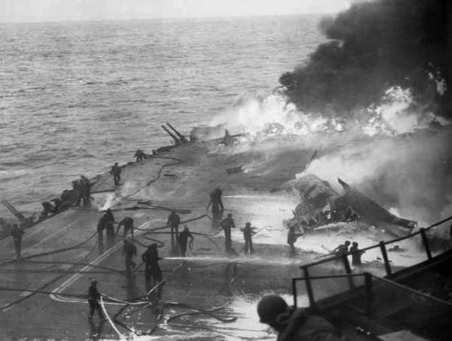 Đám cháy trên tàu sân bay Saratoga sau khi bị năm máy bay Kamikaze tấn công vào ngày 21/2/1945.