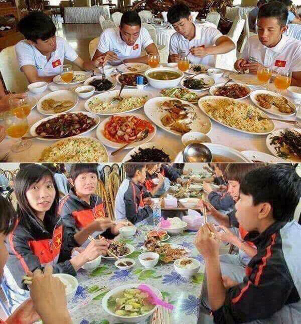 | Bức ảnh đang được lan truyền trên các trang mạng xã hội so sánh bữa ăn của ĐT nữ và U22 Việt Nam. |