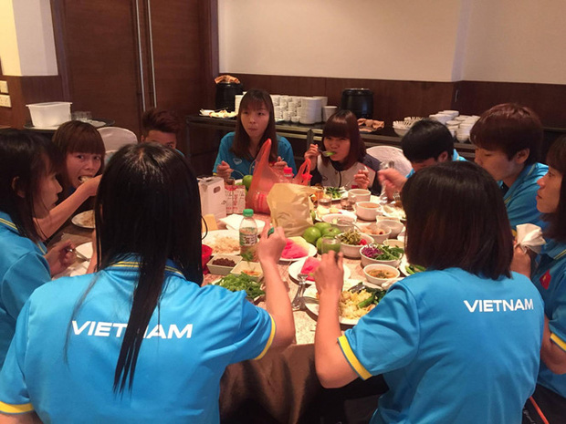 Nhưng ăn uống thì không đến nỗi tệ như trong ảnh đâu còn đặt lên bàn cân thì nữ không bao giờ như của nam. Còn nữ khi đi Nhật tập huấn, ăn uống cũng khá ổn. Ăn uống cũng tùy người, nếu không hợp thì VĐV luôn mang mỳ tôm theo. Tuy nhiên, thực tế là VĐV cũng dễ thích ứng chuyện ăn uống thôi. Cũng không vấn đề gì đâu".