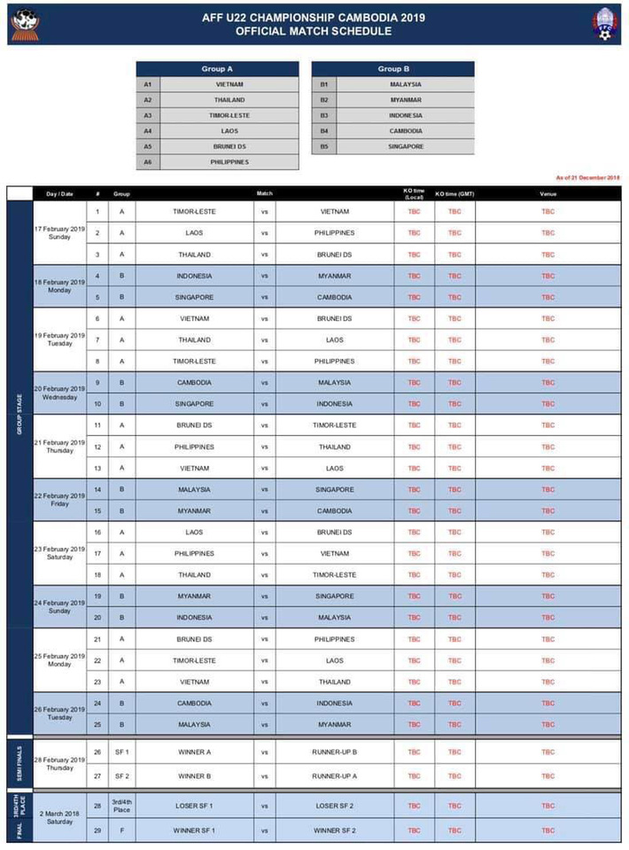 Lịch thi đấu cụ thể của đội tuyển Việt Nam tại AFF U22 2019: