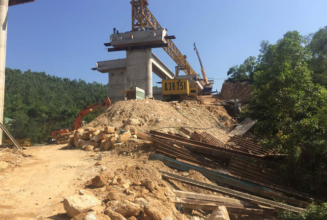 Hiện trường sự cố sập dầm cầu đường cao tốc Hạ Long - Vân Đồn. Ảnh: Tiền Phong |