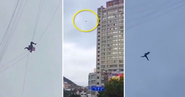 Điều khiến nhiều người giật mình là người đàn ông này đã đu dây từ tầng 19 của khách sạn và bị rơi, may mắn vướng vào cáp viễn thông nên được giữ lại.
