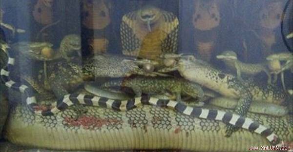 | Con rắn hổ mang chúa 45kg trong bình rượu. |