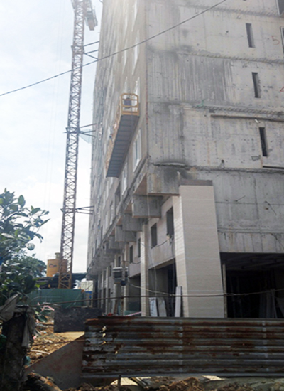 Hai công nhân ngã từ độ cao 20m khi đang đứng trên thang nâng hàng. Ảnh: Vnexpress |