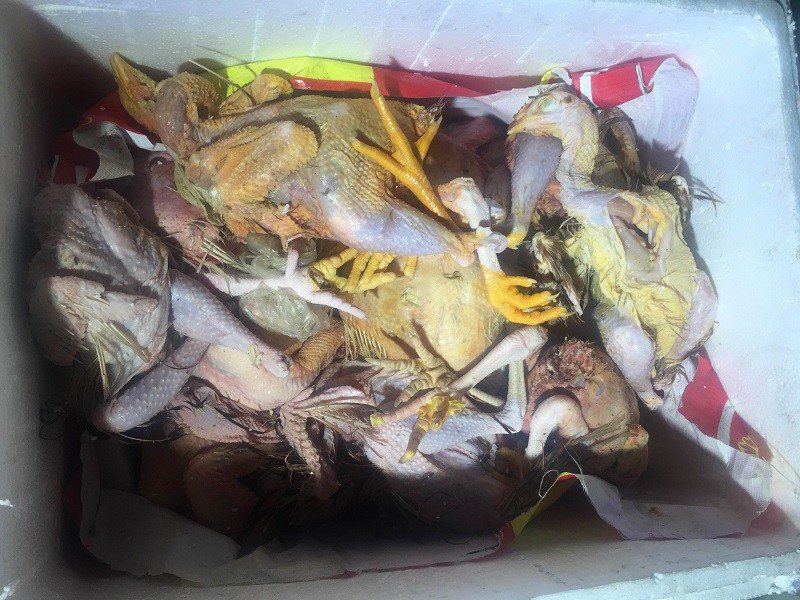 Cán bộ trạm thu y xác nhận tình trạng và kết luận: Việc bảo quản thực phẩm tươi không đảm bảo, thịt gà đã biến đổi màu sắc, thịt dê đã bốc mùi hôi thối, có dòi đục.