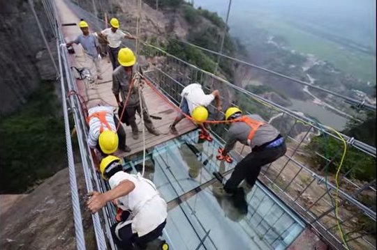 Loại kính được sử dụng để làm cầu dày 24 mm, có độ cứng gấp 25 lần so với kính thông thường. Cây cầu có thể chịu được gió lớn, động đất, sương mù và chứa được 800 người cùng một lúc.