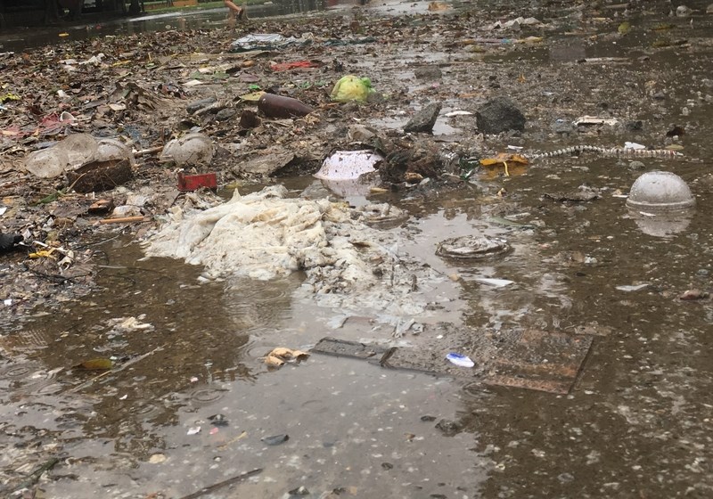 | Một số nơi thấp trũng, lượng rác thải đổ về dày đặc mặt đường. Ảnh: Pháp luật TP. HCM |