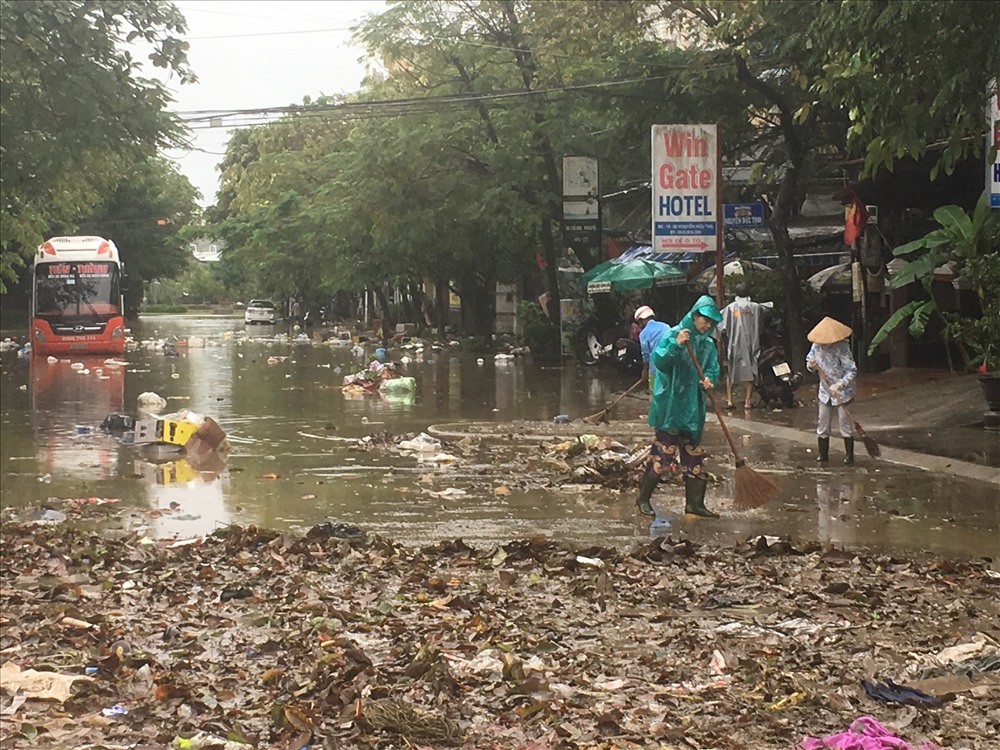 Khi nước lũ trên các tuyến đường ở thành phố Huế đã rút để lại số rác thải và bùn đất ngập ngụa chất cao như núi. Người dân và công nhân vệ sinh phải bắt tay vào dọn dẹp ổn định cuộc sống.