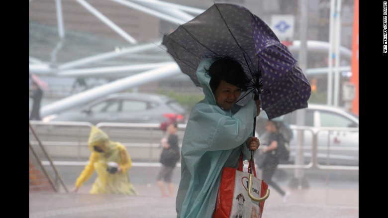 | Người đi đường vật lộn để giữ được chiếc ô trước những cơn gió mạnh. Ảnh: AP |