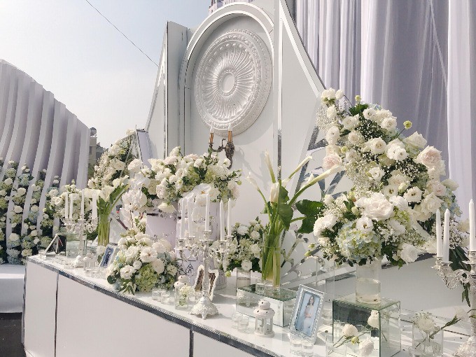 Ngoài ra, họ đã sử dụng 6.000 bông hoa cẩm tú cầu xanh, 5.000 bông hồng David Austin, khoảng 200 bó lan tường trắng và 2.000 bông hoa hồng trắng nhập khẩu để làm đẹp cho không gian tiệc cưới.