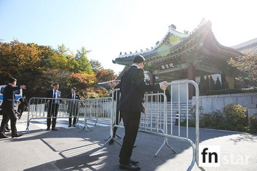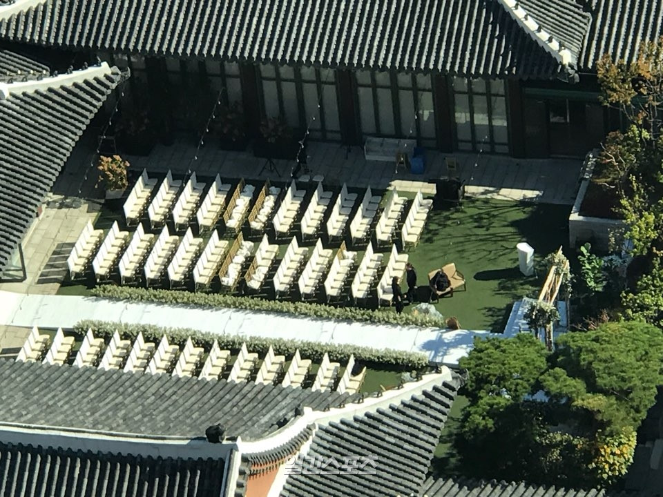 | Khoảng 10h30, mọi công tác chuẩn bị cho lễ cưới đã hoàn tất. Tờ Newsen cho rằng với việc sắp xếp ở lầu 1 Yeong Bin Gwan, khách sạn Shilla, hôn lễ của Song Hye Kyo và Song Joong Ki sẽ diễn ra ngoài trời. Ảnh: TVReport. |