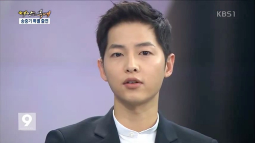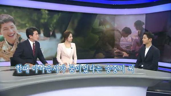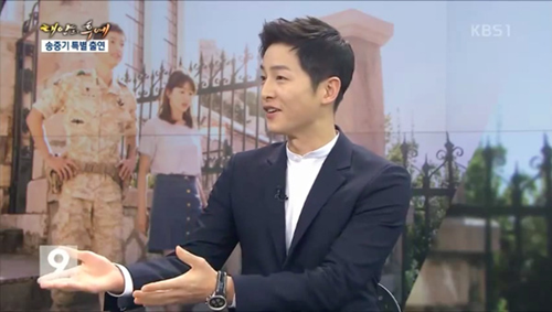 Mới đây, Song Joong Ki đã xuất hiện trên bản tin News9 của đài KBS trả lời phỏng vấn và những câu hỏi về bộ phim Hậu duệ mặt trời đang gây sốt tại Châu Á.