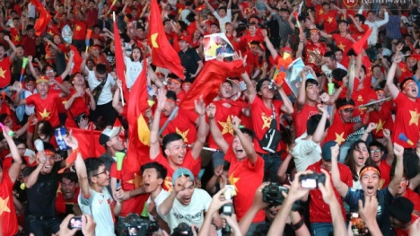 Người hâm mộ nước nhà như vỡ òa niềm vui chiến thắng khi Anh Đức mở tỷ số cho đội tuyển Việt Nam trong trận chung kết lịch sử.