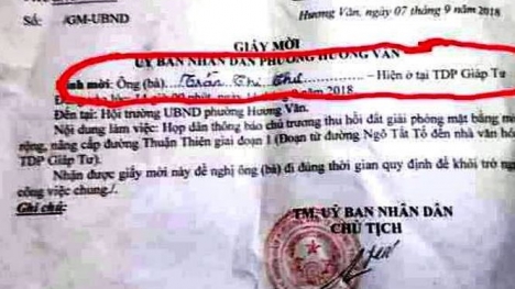Trong khi chủ hộ đã mất từ hai tháng trước nhưng lãnh đạo UBND phường ở Huế vẫn phát thư mời đích danh người quá cố đến dự họp liên quan công tác giải phóng mặt bằng.