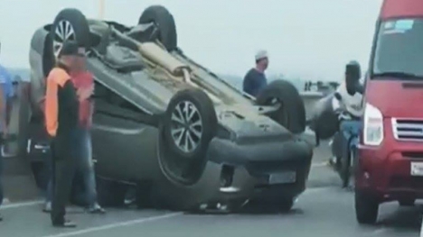 Nữ tài xế thoát chết hy hữu trong ô tô lật ngửa trên cầu Vĩnh Tuy