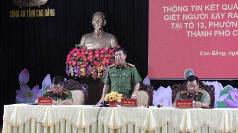 Tại trụ sở Công an, khi nghe Phó Giám đốc Công an tỉnh Cao Bằng nhắc về người mẹ của mình, nghi phạm sát hại vợ rồi phi tang xác bật khóc.