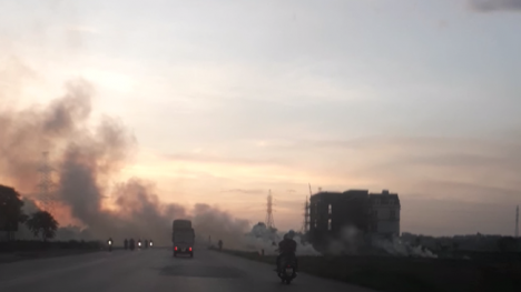 Khói đen dày đặc làm tầm nhìn bị hạn chế khiến các tài xế phải di chuyển hết sức khó khăn nhằm tránh tai nạn đáng tiếc có thể xảy ra. Sự việc được ghi nhận chiều 03/07 tại Quế Võ, Bắc Ninh.