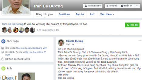 Sau khi công khai với nội dung thông tin đầu tiên về chuyện Thủ Thiêm, tài khoản Facebook của ông Trần Bá Dương, Chủ tịch THACO và Công ty Đại Quang Minh đã bị sập.