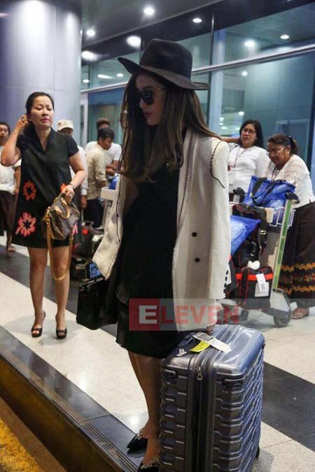 | Á hậu Huyền My rạng rỡ tươi cười khi kéo va ly của mình tại sân bay Myanmar. |