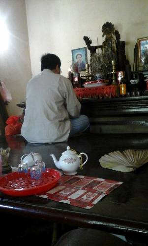 Nhà thầy Th. nằm sau một con đập, quanh năm mát mẻ, căn nhà cấp bốn rộng thênh thang. Biết ý định của chúng tôi muốn được "diện kiến" tài nghệ của thầy và nhờ thầy làm lễ cúng, sau khi cầm tờ giấy ghi đầy đủ tên tuổi địa chỉ, thầy kính cẩn đặt lên bàn thờ, rót ba chén rượu và thắp một nén hương sau đó thầy khấn vái, miệng lẩm bẩm.