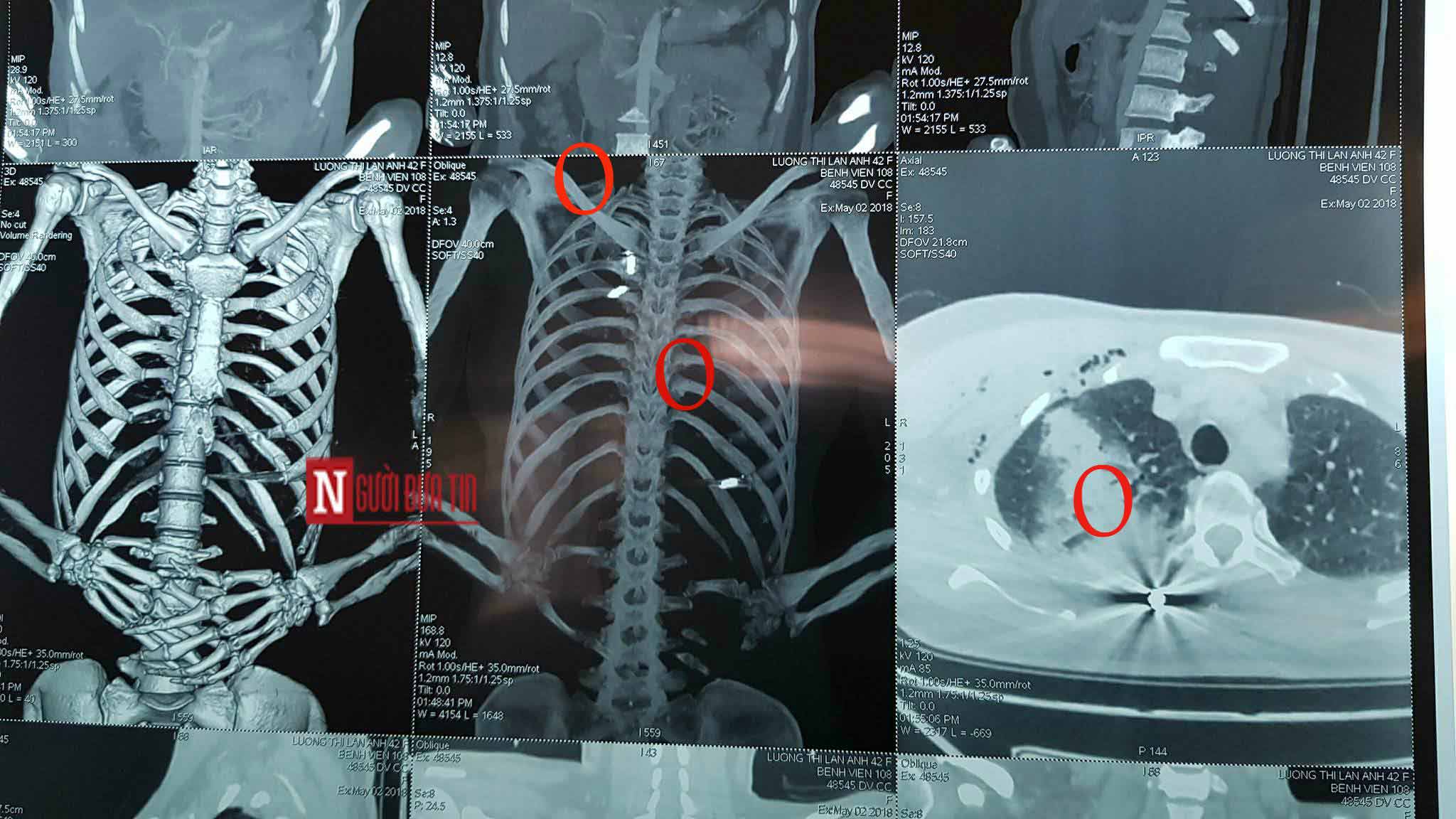 Bà Bùi Ngọc Huệ, điều dưỡng trưởng của khoa Phẫu thuật lồng ngực, cho biết: “Bệnh nhân Anh được đưa vào đây trong tình trạng hoàn toàn tỉnh táo, có thể giao tiếp được. Nhưng trên người phía sau tai, phần cổ và trước ngực có nhiều vết thương hình tròn nhỏ do vết đạn bắn vào người. Thể hiện trên phim chụp thì cho thấy có nhiều vết đạn găm vào trong người của chị Anh.