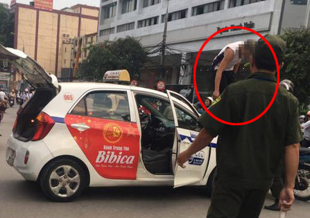 | Bị CSGT dừng xe vì đi vào đường cấm, tài xế taxi liền mở hết cửa xe rồi trèo lên nóc xe đứng. (Ảnh FB) |