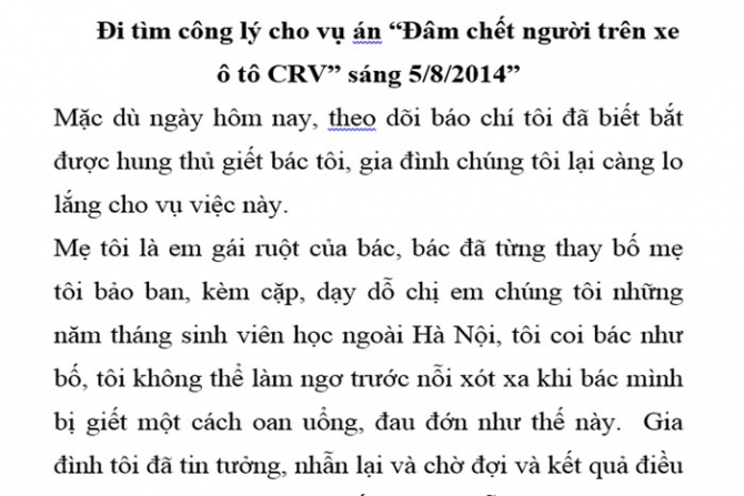 Một đoạn trong bức tâm thư của người nhà nạn nhân bị đâm chết trong ô tô.