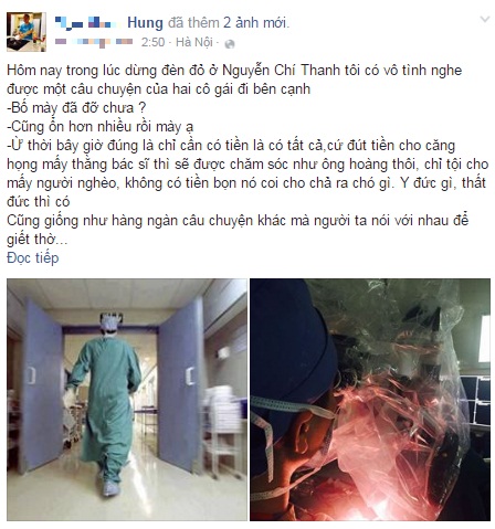 - Ừ thời bây giờ đúng là chỉ cần có tiền là có tất cả, cứ đút tiền cho căng họng mấy thằng bác sĩ thì sẽ được chăm sóc như ông hoàng thôi. Chỉ tội cho mấy người nghèo, không có tiền bọn nó coi cho chả ra chó gì. Y đức gì, thất đức thì có”.