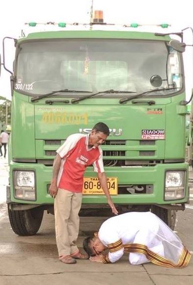 Kalangnalong quỳ gối cảm tạ công ơn nuôi dưỡng của cha trước chiếc xe chở rác của ông. |