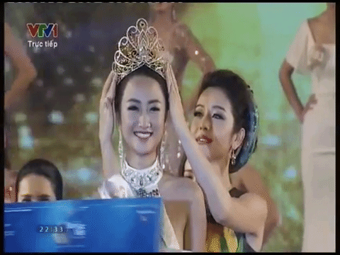 Ngay sau giờ phút đăng quang, tân Hoa hậu Thu Ngân bối rối khi chiếc vương miện không vừa vặn với đầu cô. Tân Hoa hậu 20 tuổi di chuyển khá khó khăn trên sân khấu. Jennifer chủ động tháo kẹp tóc của mình để cài lại vương miện cho 'đàn em'.
