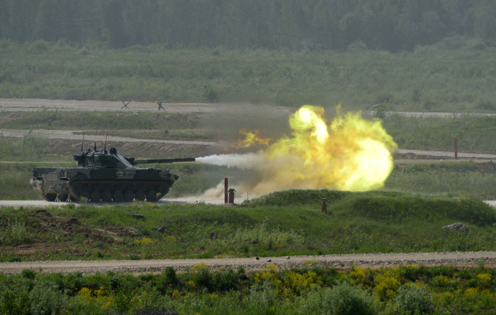 Xe tăng T-80 khai hỏa. Với tốc độ lên tới 70km/h, T-80 là một trong những mẫu tăng chiến đấu chủ lực nhanh nhất hiện nay. |