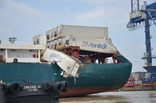 Tại hiện trường, phần đuôi tàu bị móp méo, thùng container còn lại hư hỏng, nằm vắt vẻo trên thành tàu.Vụ việc đang được điều tra.