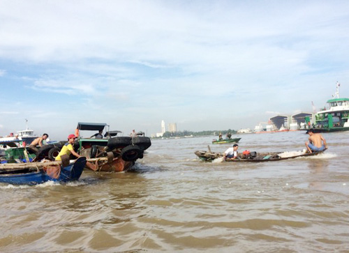 Phòng CSGT đường thủy (PC68) Công an TP HCM điều hai tổ công tác phối hợp với Cảng vụ TP HCM… phong tỏa hiện trường, điều tiết giao thông qua đây và ngăn người dân lao xuống hôi của.