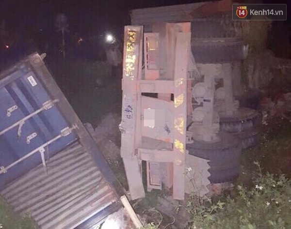 Chiếc container bị lật nghiêng trên đường - Ảnh: Đức Tùng/ Vnexpress |
