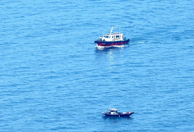 9h: Tàu hoa tiêu rời cảng để chuẩn bị đón tàu sân bay USS Carl Vinson. Nhiều người dân và phóng viên đã đến những vị trí thuận lợi để theo dõi siêu tàu sân bay vào cảng.