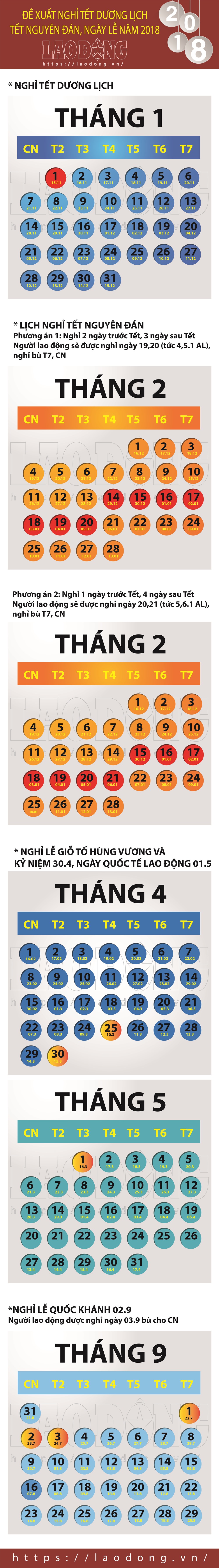 Trên cơ sở các ý kiến đồng thuận, Bộ LĐ TB&XH đang khẩn trương tổng hợp trình Chính phủ cho ý kiến cuối cùng về phương án nghỉ các ngày lễ, tết năm 2018. Dự kiến, lịch nghỉ lễ Tết Mậu Tuất sẽ được thông qua trong tháng 11.