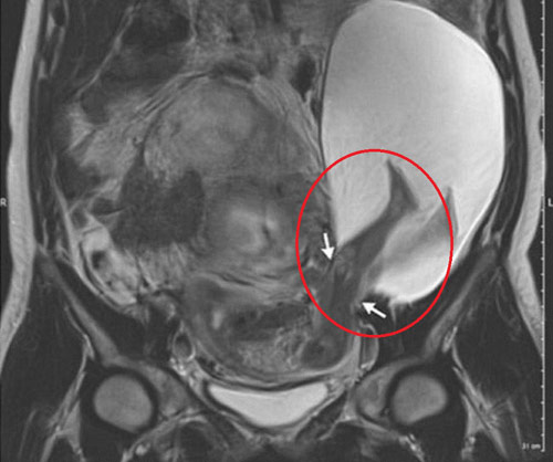 "Một người phụ nữ 33 tuổi đi siêu âm ở tuần 22 thai kỳ và được phát hiện có một túi nước nhỏ như một phần của túi ối bị thoát ra khỏi thành tử cung. Chụp cộng hưởng từ cho thấy túi nước này có đường kính khoảng 2,5cm và chứa 2 chân của thai nhi", bác sĩ sản phụ khoa Pierre-Emanuel Bouet chia sẻ trên tạp chí Y học The New England.