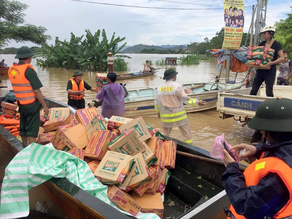 | Các nhân viên cứu hộ chở những chiếc thuyền để cứu trợ lương thực, thực phẩm cho người dân ở Thanh Hóa. Theo AFP |