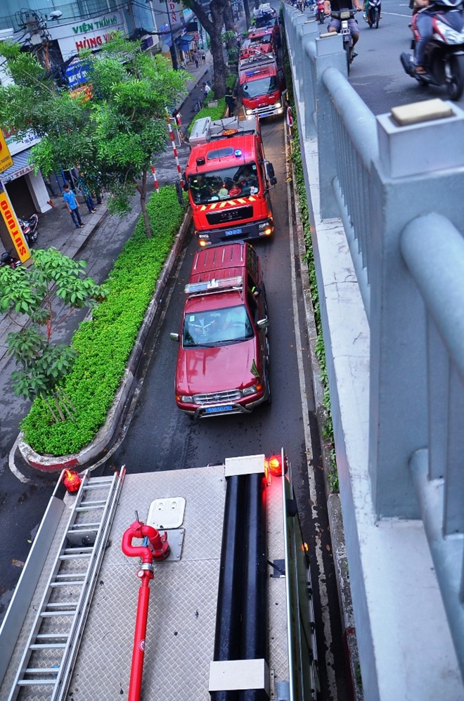 Nhận tin báo, lực lượng PCCC quận 1 và quận 11 đã điều 10 xe chữa cháy cùng hàng chục cán bộ chiến sĩ đến hiện hiện trường.