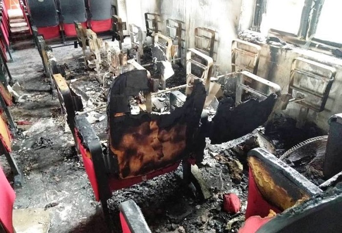 | Hàng chục chiếc ghế trong hội trường bị thiêu rụi. Ảnh LĐO |
