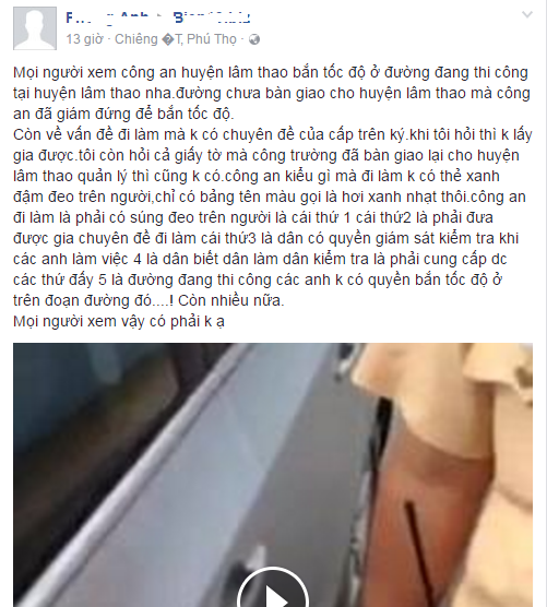 Trong clip, chiến sĩ CSGT huyện Lâm Thao (tỉnh Phú Thọ), đã rất từ tốn giải thích lỗi vi phạm vượt quá tốc độ cho phép đến 77km/ 60km cho người điều khiển xe, nhưng lái xe một mực khẳng định CSGT Lâm Thao đã làm sai, và thanh niên này thậm chí còn thách thức, hù dọa đăng tải hình ảnh tổ công tác lên mạng xã hội.