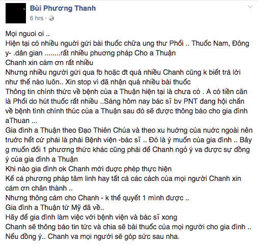 Trước đó, Phương Thanh cũng chia sẻ thông tin về Minh Thuận, cô gửi lời cám ơn đến những khán giả đã yêu quý Minh Thuận và gửi đến anh những bài thuốc dân gian, cách điều trị bệnh ung thư phổi thông qua facebook và tin nhắn của Phương Thanh.