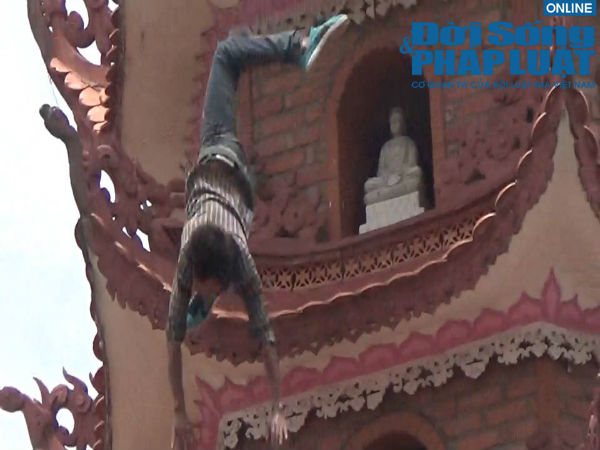 | Khoảnh khắc nam thanh niên ngáo đá nhảy từ tầng 11 tòa bảo tháp xuống đất ngày 21/7. |