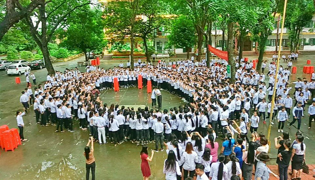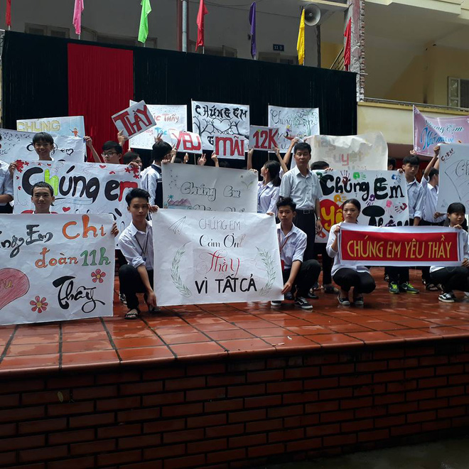 Ngày 30/9, cả không gian trường ngập tràn trong sự xúc động và tiếc nuối. Các học sinh đứng xếp thành hình trái tim - món quà ý nghĩa dành tặng thầy hiệu trưởng. Rất nhiều bạn mang theo băng rôn, biểu ngữ để thể hiện tình cảm với thầy, nào là "Chúng em yêu thầy, chúng em cảm ơn thầy vì tất cả", "Mãi yêu thầy", "Chúc thầy công tác tốt"...