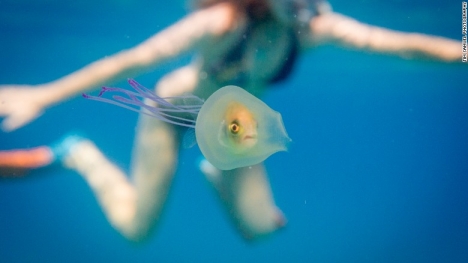 Một nhiếp ảnh gia đại dương người Australia mới đây đã chụp lại được hình ảnh nghìn năm có một: chú cá nhỏ bất lực nằm gọn trong bụng con sứa.